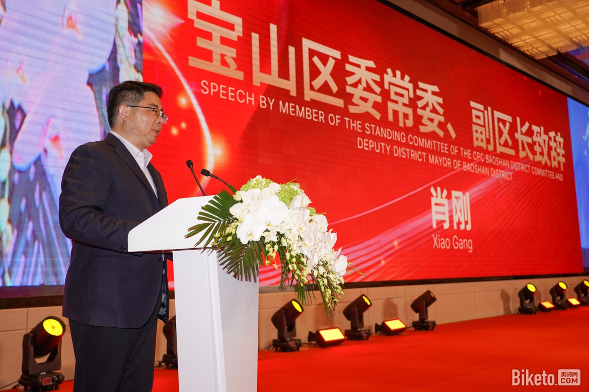 宝山区委常委、副区长肖刚致辞。他首先对永久 85 周年庆典的举办表示热烈祝贺,深情回顾了永久与宝山区的深厚渊源,期待永久继续以‘永久’精神引领行业,与宝山携手,为中国自行车产业高质量发展贡献‘宝山力量’!