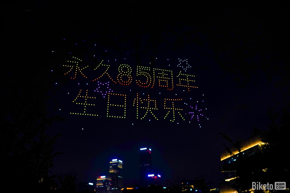 ▲ 600 架无人机组成“永久 85 周年生日快乐” 的璀璨字样在暮色里绽放