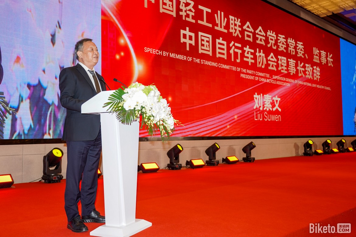 中国轻工业联合会党委常委、监事长、中国自行车协会理事长刘素文先生致辞,以 “40 年行业见证者” 的身份分享洞察:“中国自行车产业已从‘制造大国’迈向‘制造强国’,未来要聚焦绿色低碳、智能创新、品牌升级,推动产业高质量发展。”