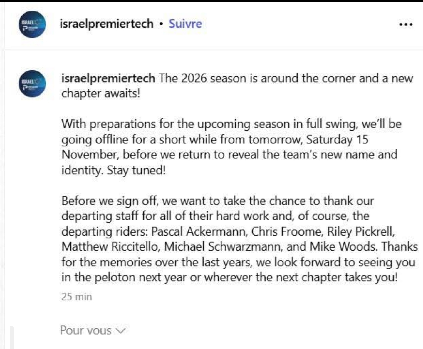 尽管我向车队新闻官求证,他给我的答复是模棱两可,但是依我接触弗鲁姆的经历看他大概率会选择合适的时机自行宣布退役消息。首先是他在2025赛季中期一次自行训练期间受伤,基本上缺席本赛季剩余赛事,加上以色列博泰车队声名狼藉,导致弗鲁姆没有机会像另一位传奇卡文迪什参加一场退役赛风风光光的退役。当前,所有世巡赛车队新招募的名单基本临近满员,次一级的洲际职业队没有500万年薪招募一位超40岁老将的预算,留给弗鲁姆本人只有退役一条路可选。因此,我预计弗鲁姆选择合适时机自行宣布退役。
