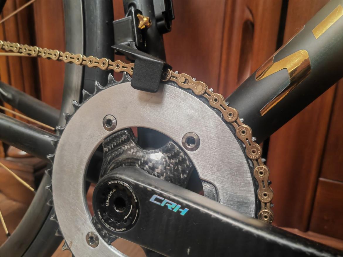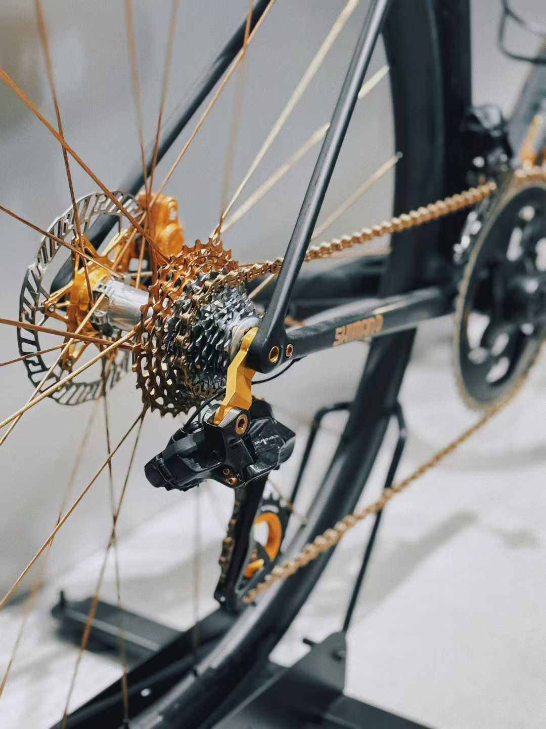 车把如前文所述,更换为了Darimo,坐管碍于预算换成了HY的85克版本,链条更换为了Sumc的金色全镂空进行搭配,重量也随之顺利减到了5.00kg。