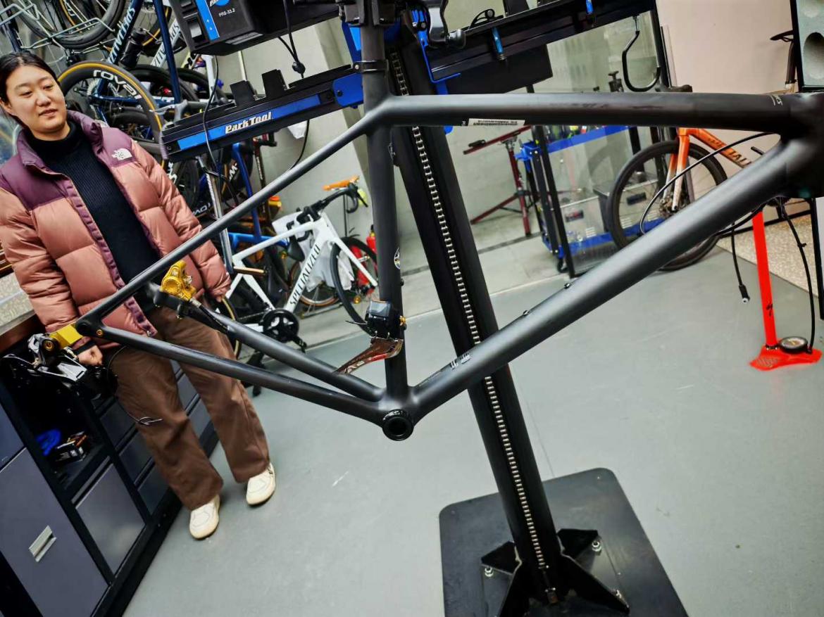 同时满足轻量化和碟刹的车架组不多,Aethos是其中的佼佼者,甚至可以说是最极致的减重选择之一。那么唯一的涂装是UCI认证贴纸的一代Aethos裸碳版就顺理成章地成为了我选定的车架组(下图这个一点都不好看的架子)。