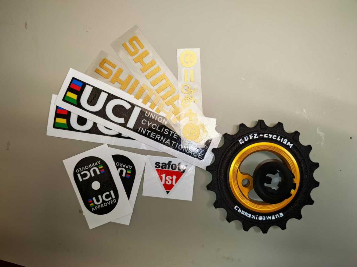 既然选择了金色系的夹器,那半金半银的日辉飞轮,中子盘片和Chaser碟片也都被纳入了物料之中。作为点缀,整车几乎所有螺丝都被替换成了S-Parts的钛螺丝(减重聊胜于无,但好看嘛)。偏心大导轮(只有20克诶)和亿点点好看的小贴纸也是不能少哒~