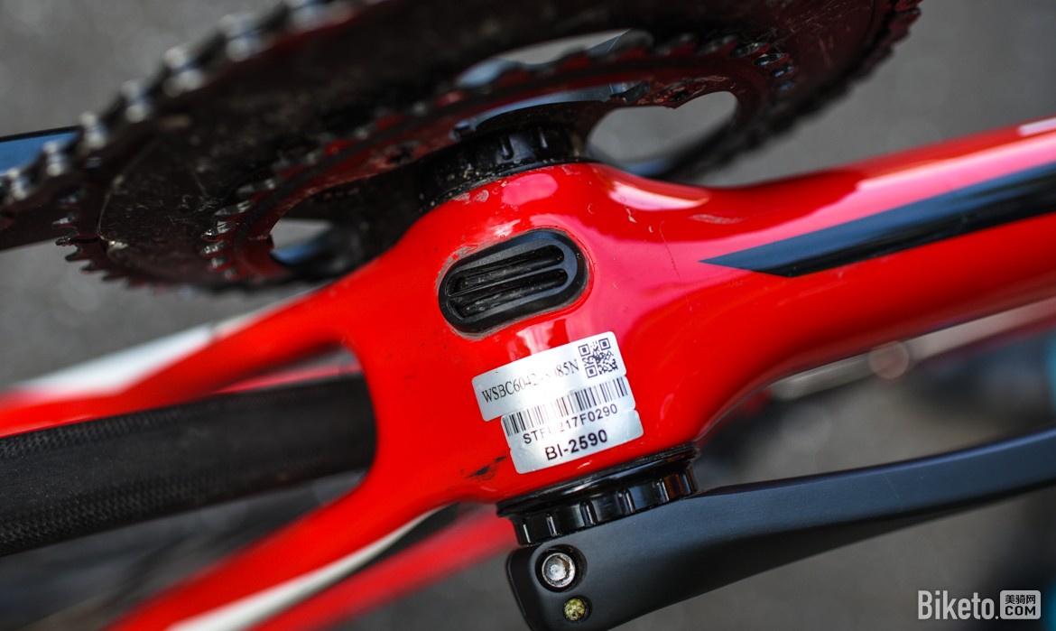 大家都知道S-Works级别的SL6碳纤维材料升级为FACT 12r,按照技术下放的原则,这辆SL6 Expert怎么地也是11r了吧?很遗憾,隐藏在后上叉内置的水标告诉我们,SL6的次顶级车型Expert仍为10r碳纤维。不过10r的车架升级也是十分明显的,重量降低了接近200克!