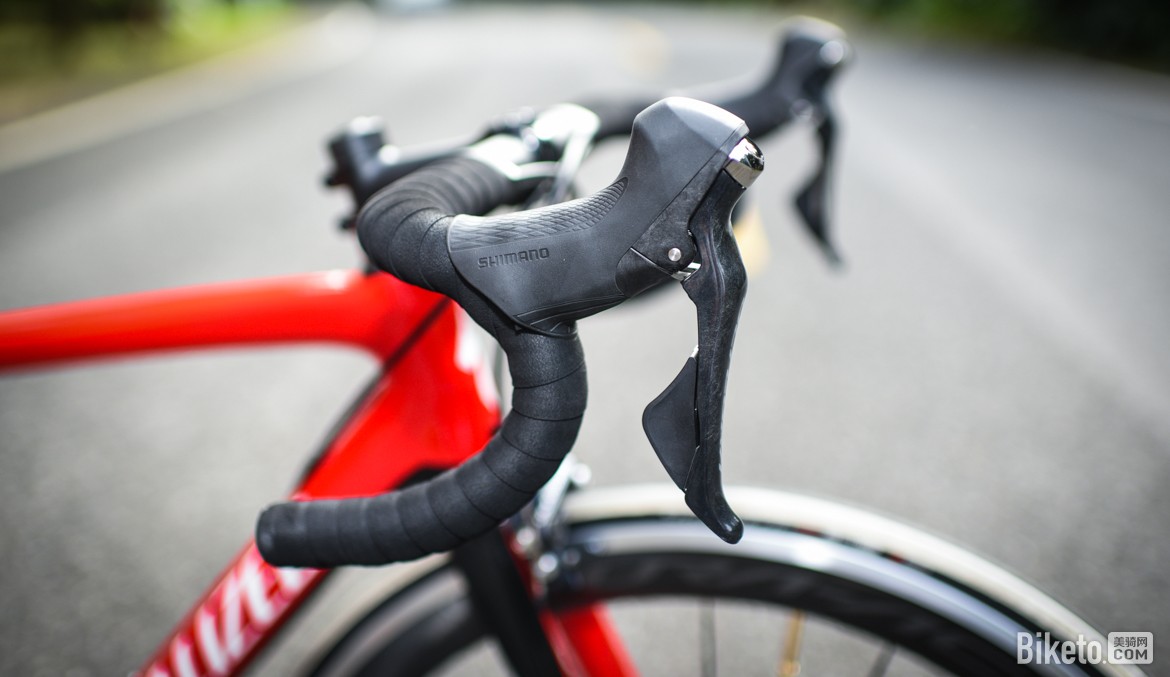 把组为纤细的Specialized Pro SL把立搭配Expert Shallow Bend铝合金弯把。弯把使用紧凑弯型,数据为123mm Drop和75mm Reach,非常友善。上把使用前外走线,安装线管后正好形成一个宽截面,搭配S-Wrap凝胶把带,握感非常舒适。不过要吐槽下的是Specialized一如既往地给52码车架配备42cm宽弯把,对于使用52码的亚洲用户群体来说,是有点过宽了。