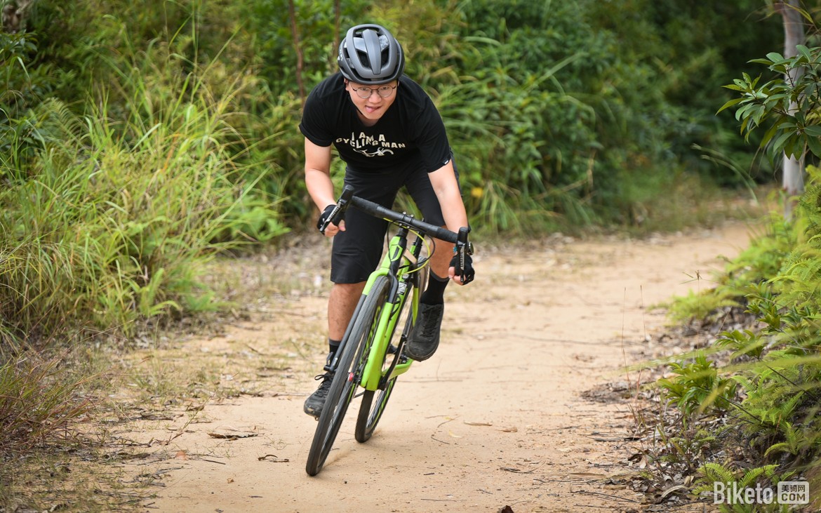 陡峭的长下坡两边是雨水冲刷的深沟,中间则是登山者凿出来的“步梯”,这样的路段已经超过这辆车的使用范畴,属于超强度测试。得益于CADEX AR弯把不错的缓震舒适性和操控稳定性,车头没有出现原装弯把骑乘时的大幅度“弹跳”状态,稳稳下山。