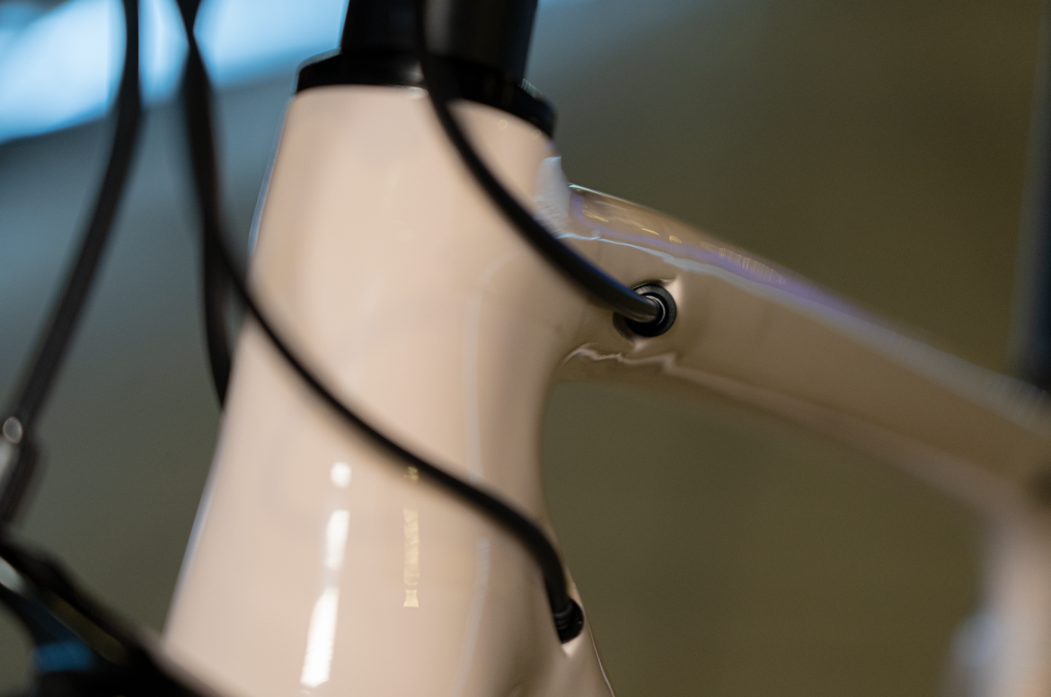 不过这也让我摸了很久TFSA的内部,我想我还是很有话语权的,毕竟一直摸车架40分钟之久的人全国还能找到第二个吗?车架整体内壁做工确实可以很平整让人看上去也很舒服,但是一旦涉及到穿线孔这个部位做工就直线下降,可以说全是毛刺非常剌手,前叉碳布堆叠也很工整重量有400克有点偏重,但是整体做工是完完全全对得起它2300多的价格。随车附送的座管是碳纤维材质,不过不是圆形而是水滴形的,后期更换兼容性会差一点。