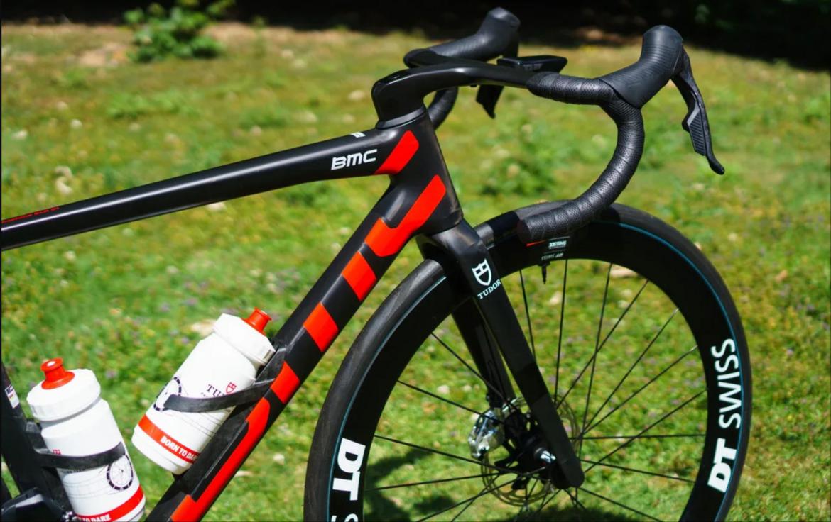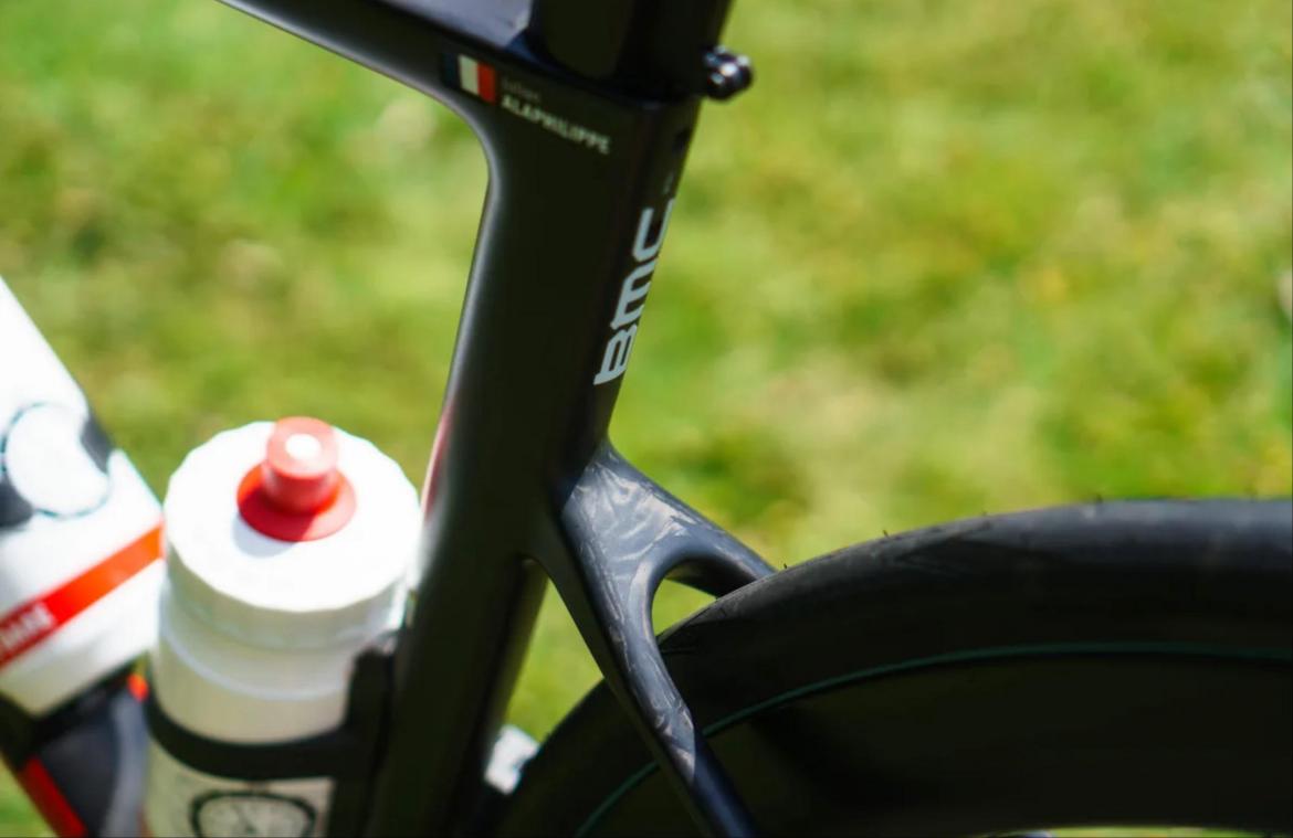 为了减轻重量,阿拉菲利普的自行车很可能采用了裸碳+清漆的涂装,下管上印有巨大的红色 BMC 标志。