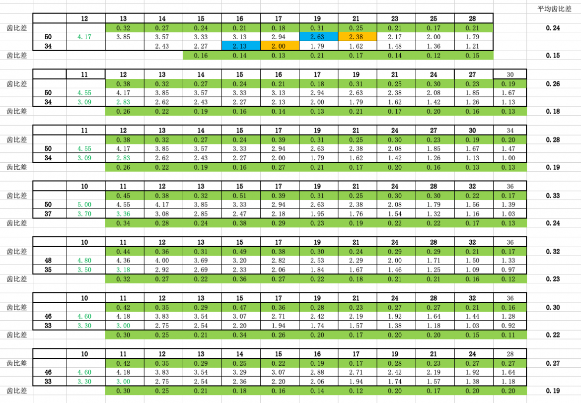 禧玛诺压缩盘配11-34飞轮的平均齿比差为0.28和0.19,而SRAM最低的46-33配10-36飞轮平均齿比差为0.3和0.22,即使是最绵密的46-33配10-28飞轮也得0.27和0.19,找不到合适的齿比就是难免的了。