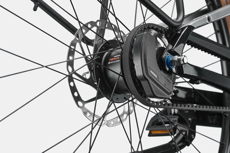 高端的FlyingV 1配备了禧玛诺顶级的内变速花鼓与Di2电子变速系统。换挡可以全自动运行,基本上为你自动换挡。FlyingV 2则使用了更传统的禧玛诺Nexus机械内变速花鼓……这款没有自动换挡功能。