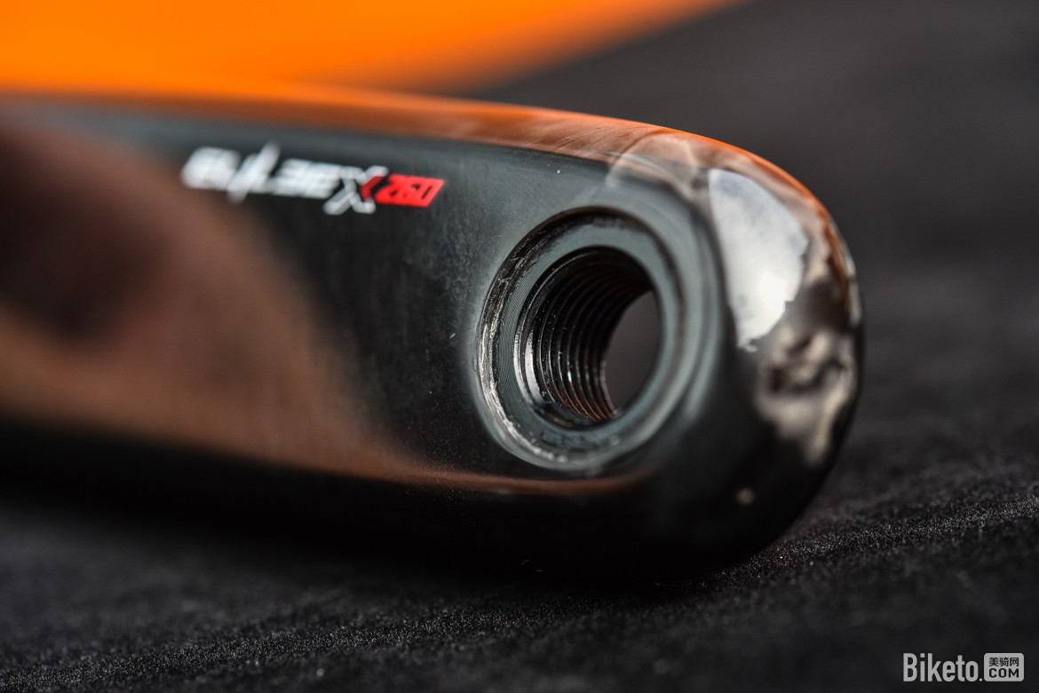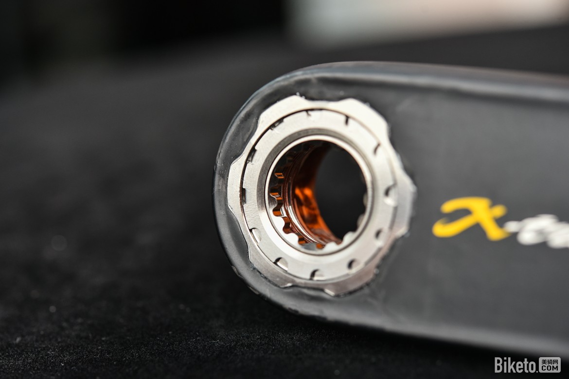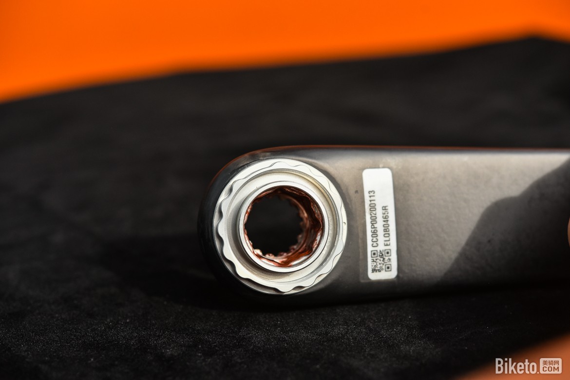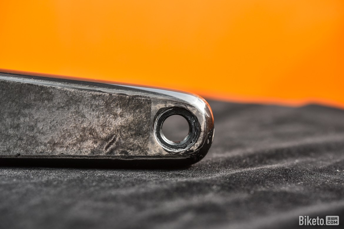 碳轴心曲柄会使用复杂的一体式结构,所以非驱动侧曲柄与轴心连接处没有金属嵌件,降低了重量。