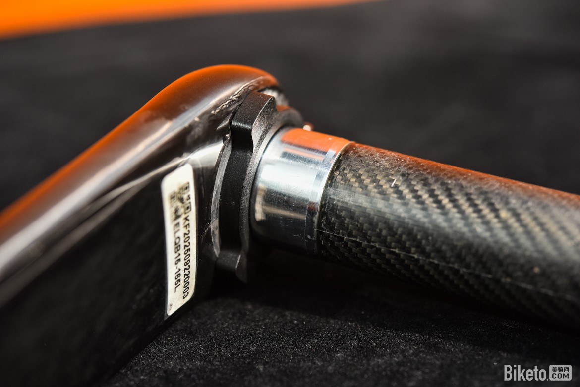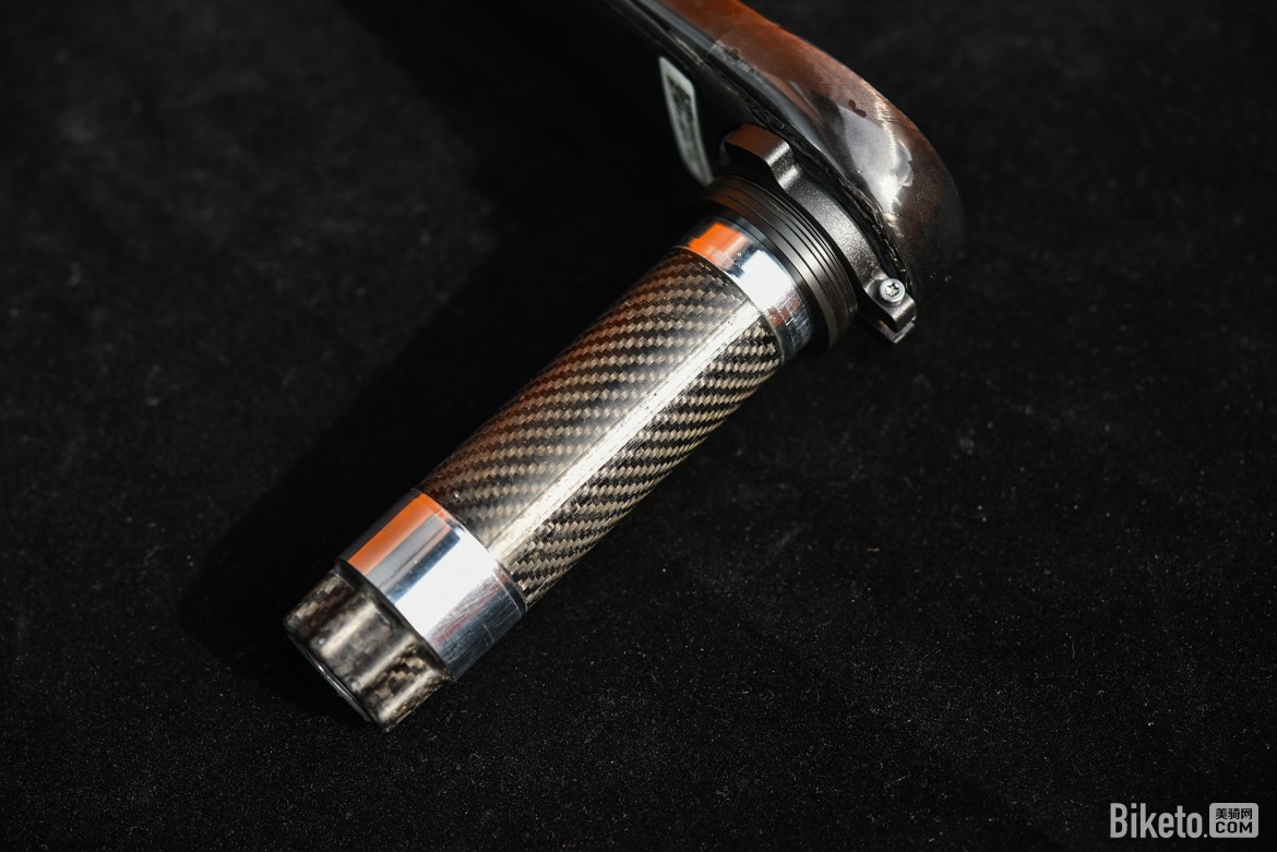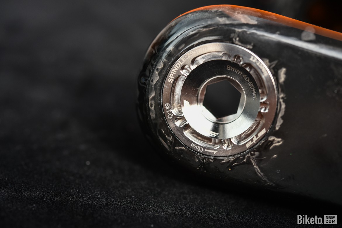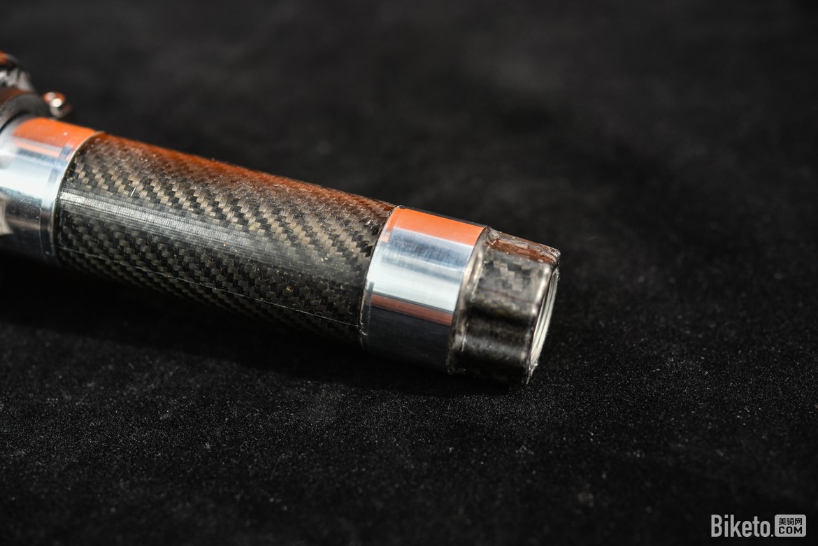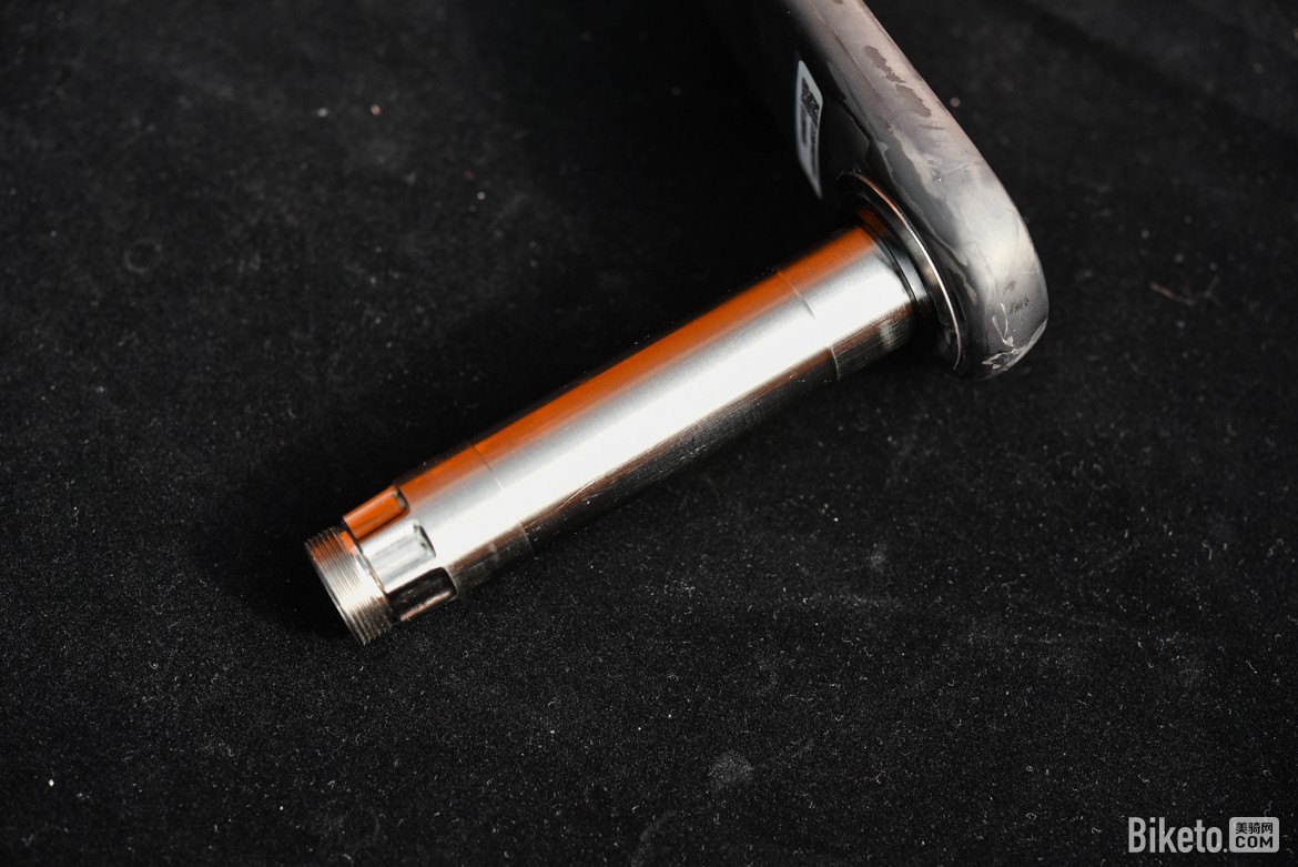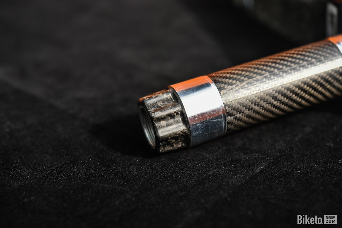 众所周知,碳纤维材质不能直接做螺纹,特别是这种受力十分大的部位,所以花键内部还是嵌了一个铝的螺纹套。