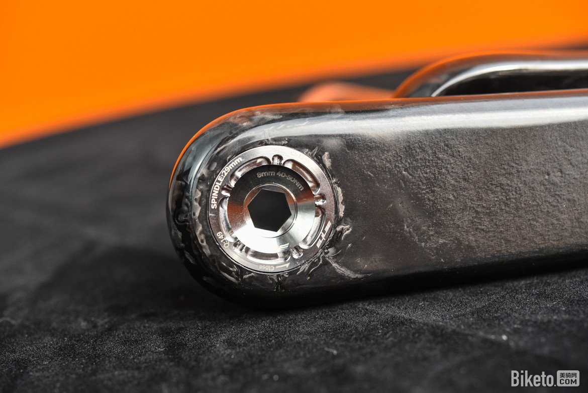 一体式碳轴心为轻量化做出不少贡献。轴心采用目前通用性最高的29mm规格,也就是DUB规格。