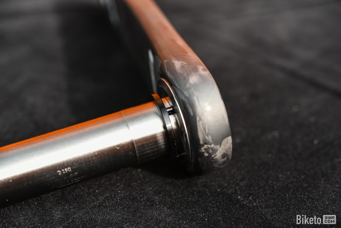 由于轴心与中轴之间会有一定摩擦,而碳纤维表面又不耐磨,所以不能直接接触中轴。老款X-Novanta是使用分体式衬套来避免轴心直接接触,而新款在成型过程中就将铝套嵌在轴心表面,使用起来更加方便,正式市售版会预涂油脂。