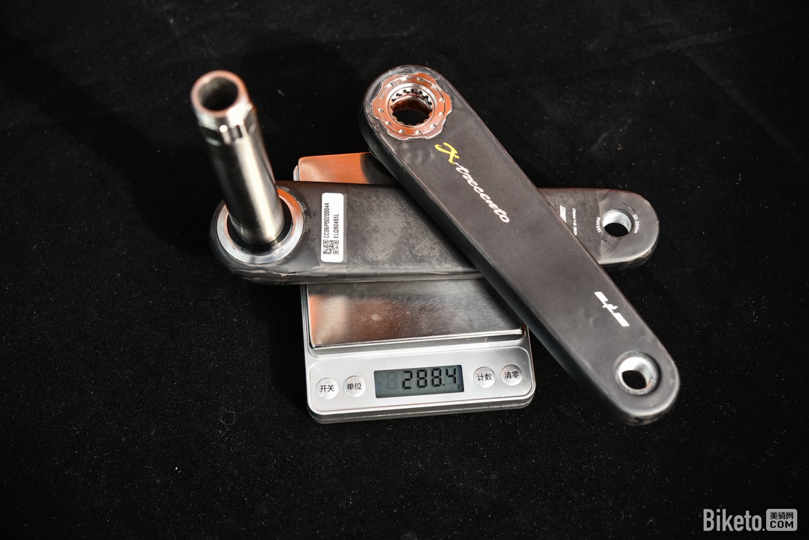 165规格的X-Trecento实称重量为288.4克,比官方重量285克略重一些,不像X-Novanta那样还有惊喜。不过作为一款24mm轴心的曲柄组来说,低于300克已经是非常轻的重量。对比小编现在在用的钛轴曲柄,有将近40克的重量优势。