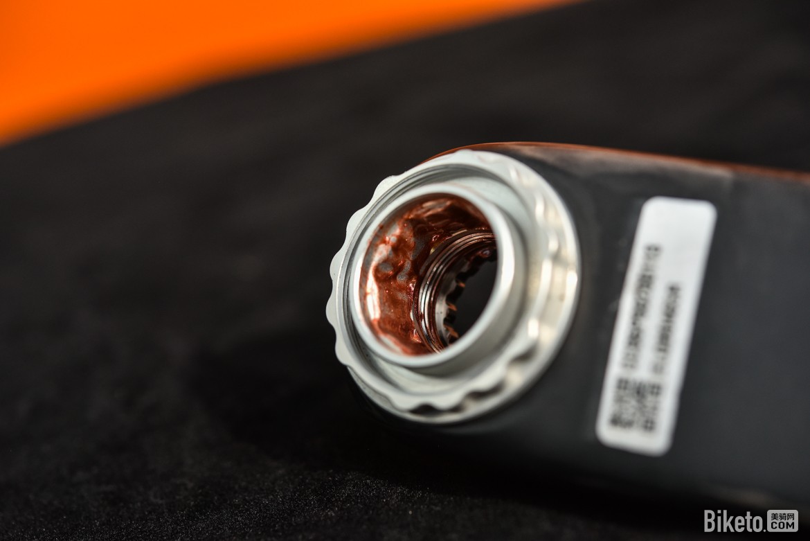 为了避免DUB轴心拆卸时“喜闻乐见”的场景,即使是全铝结构,花键接口内也预涂了防融合剂。