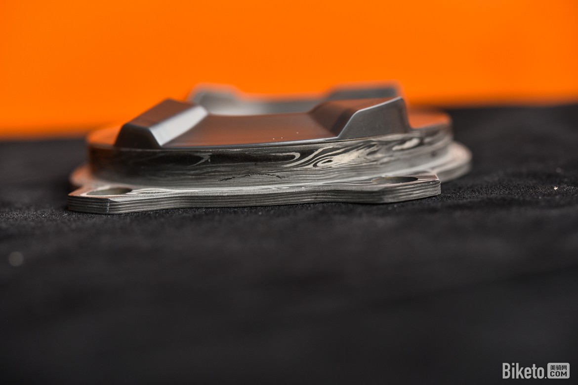 自卸盖从老款的六钉结构改成了传统的反牙螺纹结构,盖子与螺丝全部使用钛合金材质,顶级曲柄下料就是猛。可能是为了体现钛合金的质感,所以锁盖部分特意没有使用黑色阳极处理。自卸盖目测是需要专用工具进行拆卸,不过一般也没谁会去拆它。