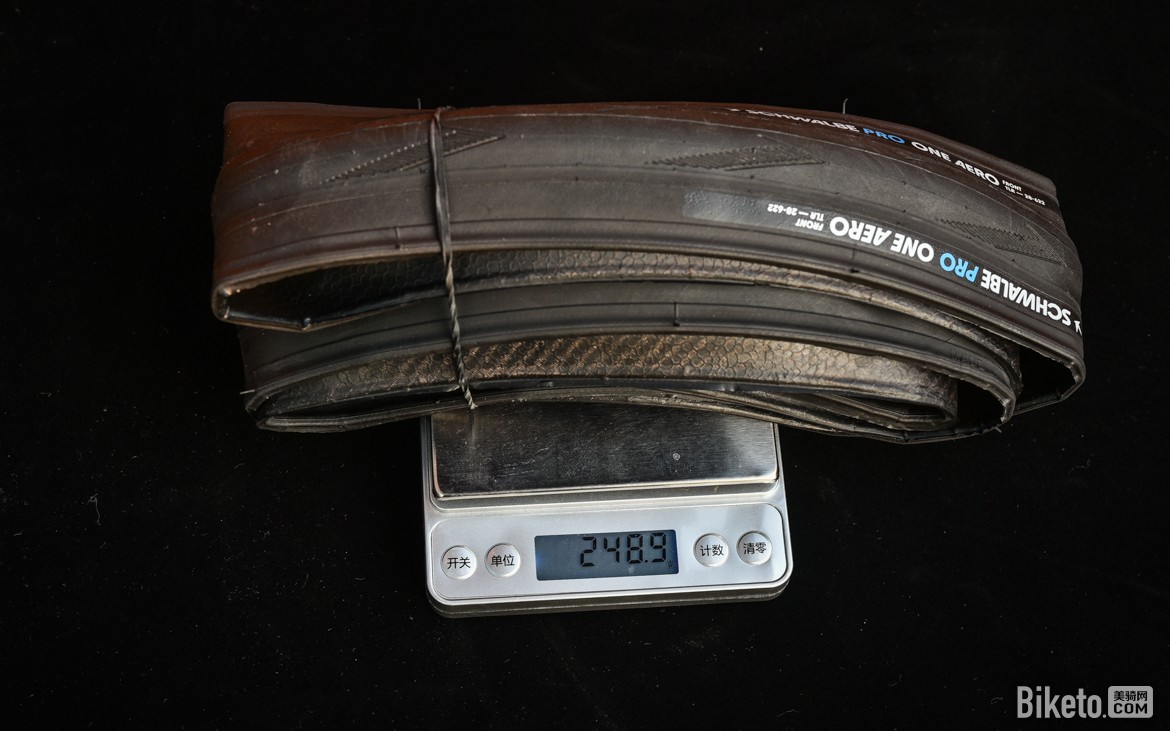 得益于更薄的胎面和窄的胎体,PRO ONE AERO前胎会具有一定重量优势。官方宣传重量为235克,实称为248克,虽然与官方重量有些出入,但作为一条28c的真空胎,248克也已经是非常好的重量。