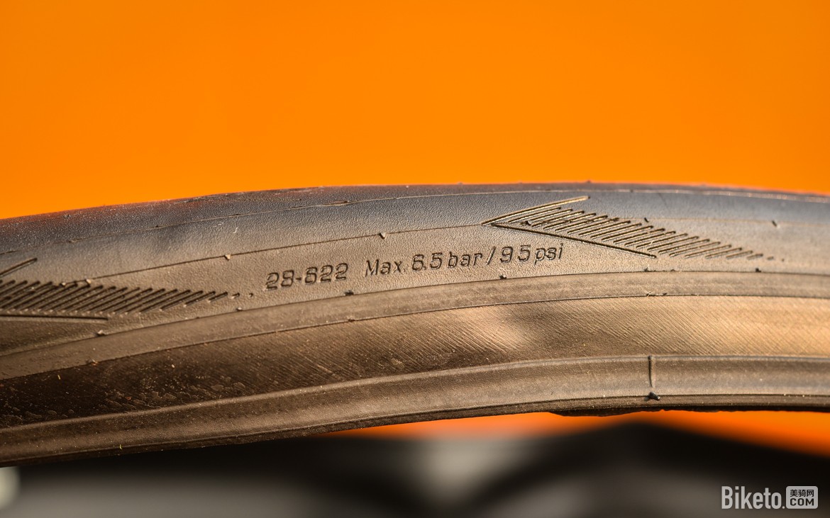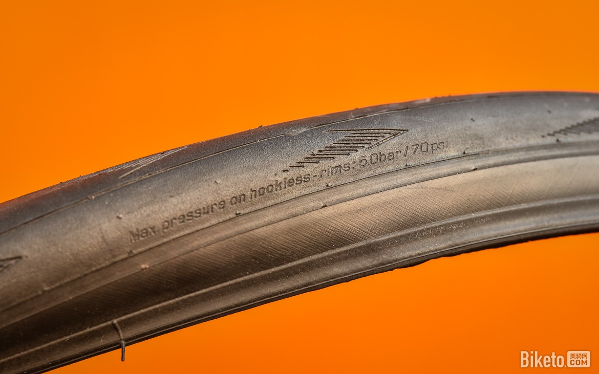这款轮胎支持无钩圈,无钩圈的胎压限制还要分开标注。需要注意的事,这款胎在无钩圈时的限制胎压为70psi,而非ETTRO标准的72psi。