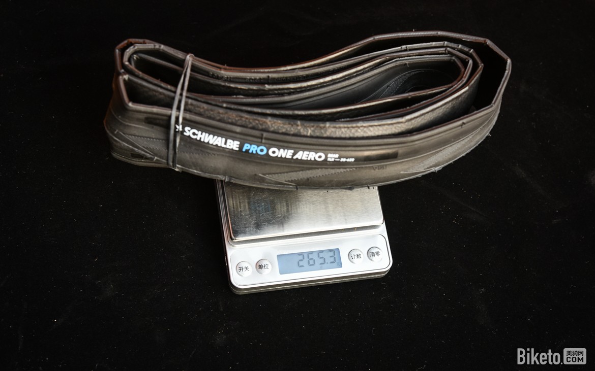 后胎由于加宽加厚,所以要重一些,官方重量为270克,实称重量265.3克,比官方重量还轻了一些,看来SCHWALBE轮胎在重量控制方面比较随意。