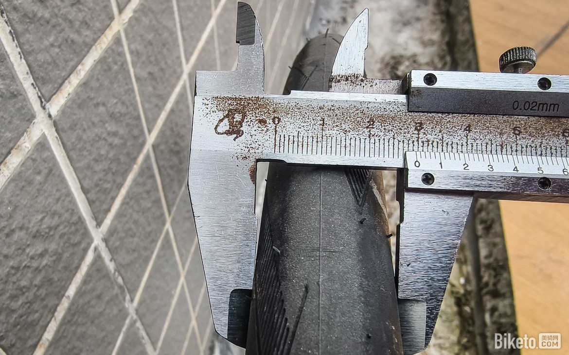由于后胎需要兼顾耐用性,所以加厚了胎面,官方表示后胎胎面会厚0.4mm。实称后胎中央胎面达到了2.9mm,与官方数据差不多。