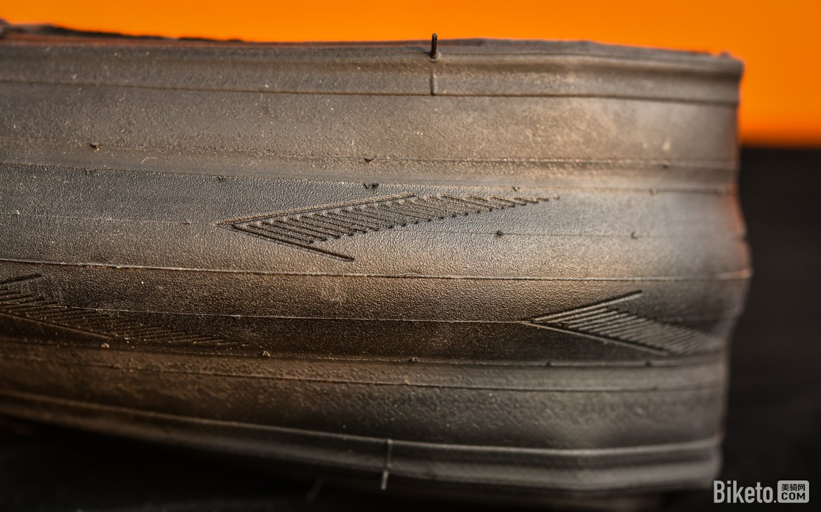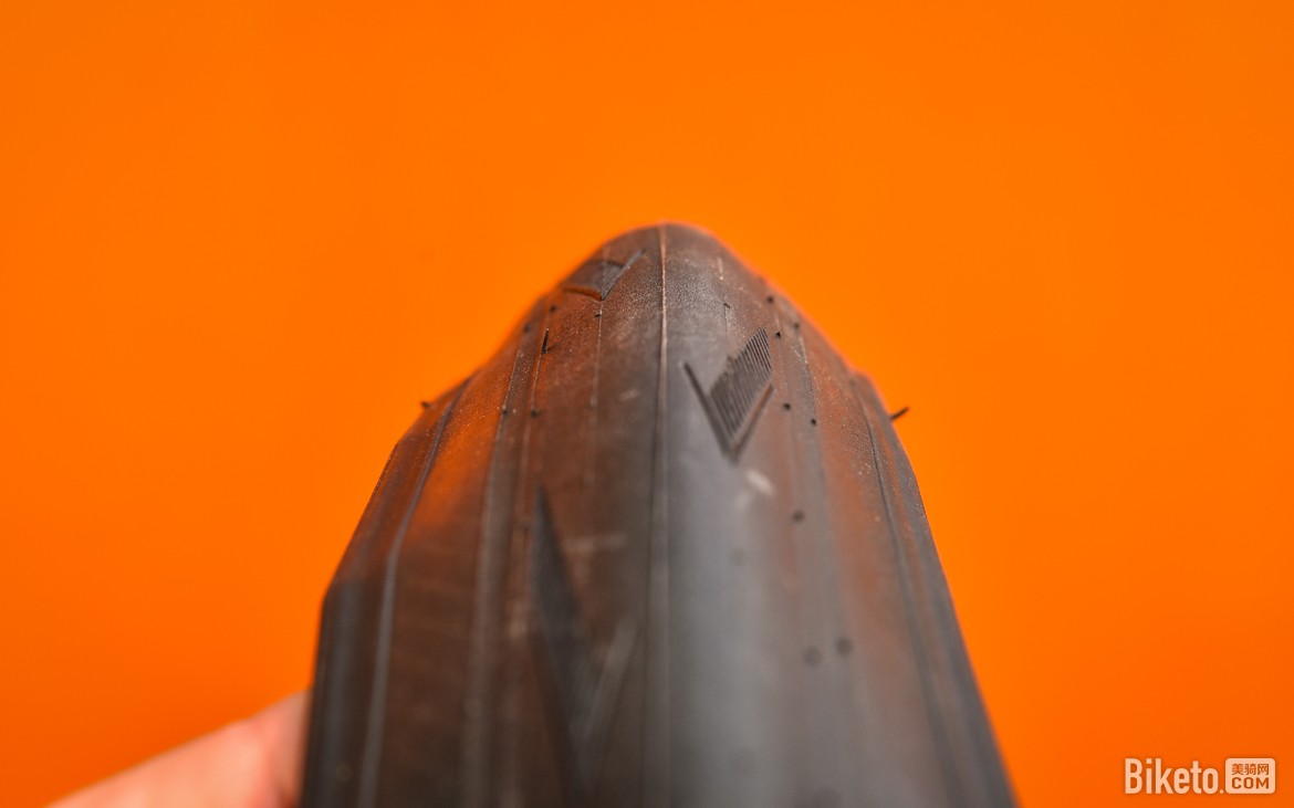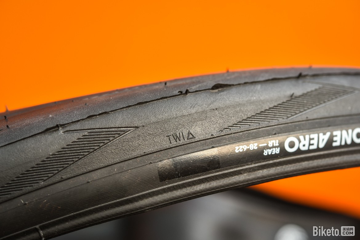 先拿个前胎看看。前胎是整车第一个接触到气流的地方,所以使用更“尖”的胎形,来提供气动优势。