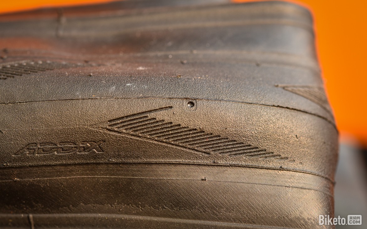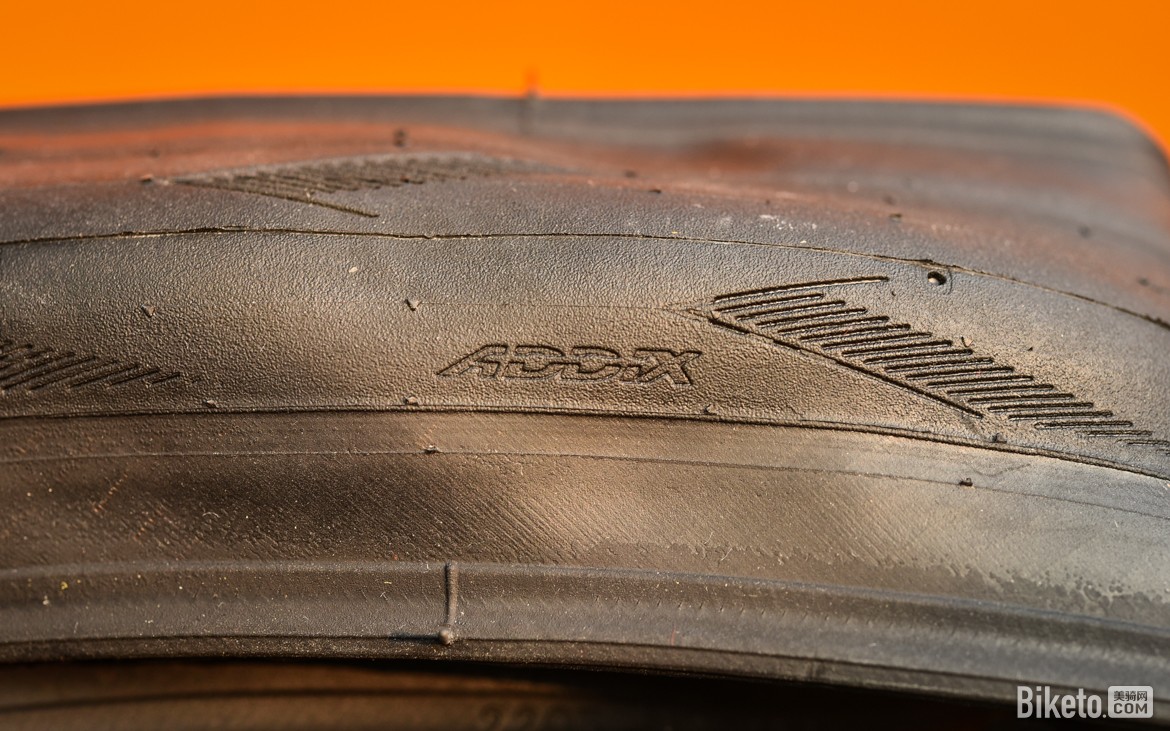 比较有意思的是,SCHWALBE将轮胎信息都刻在了胎肩上,比如这个ADDiX胶料配方Logo。