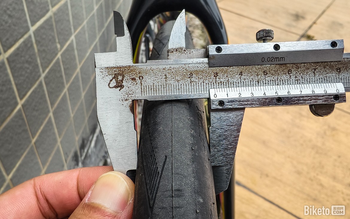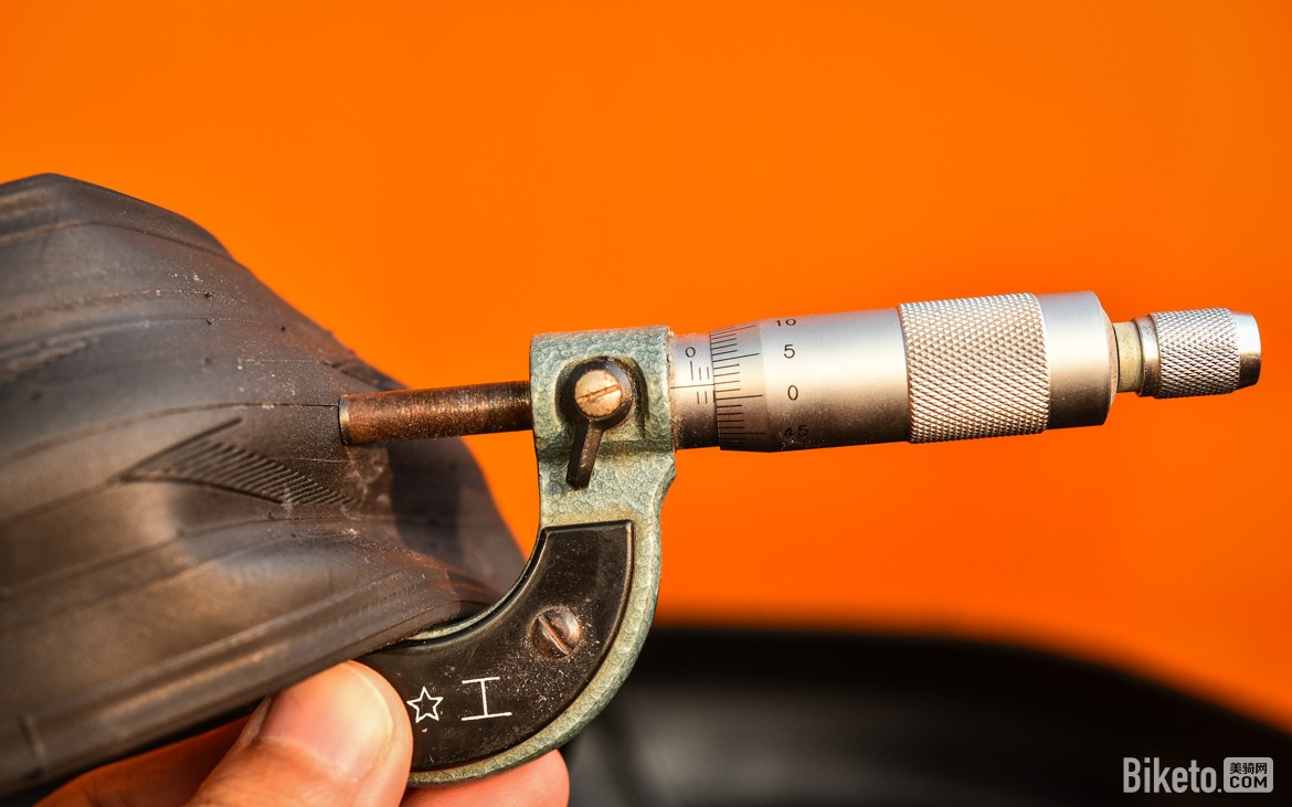实测下数据,众所周知,前轮胎面磨损速度会比后轮慢很多,所以PRO ONE AERO的前胎使用更薄的中央胎面,实称厚度为2.5mm左右。