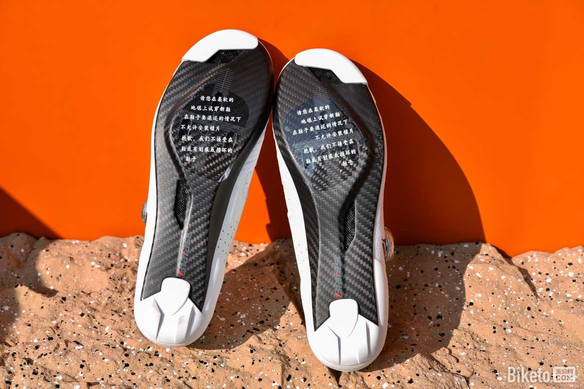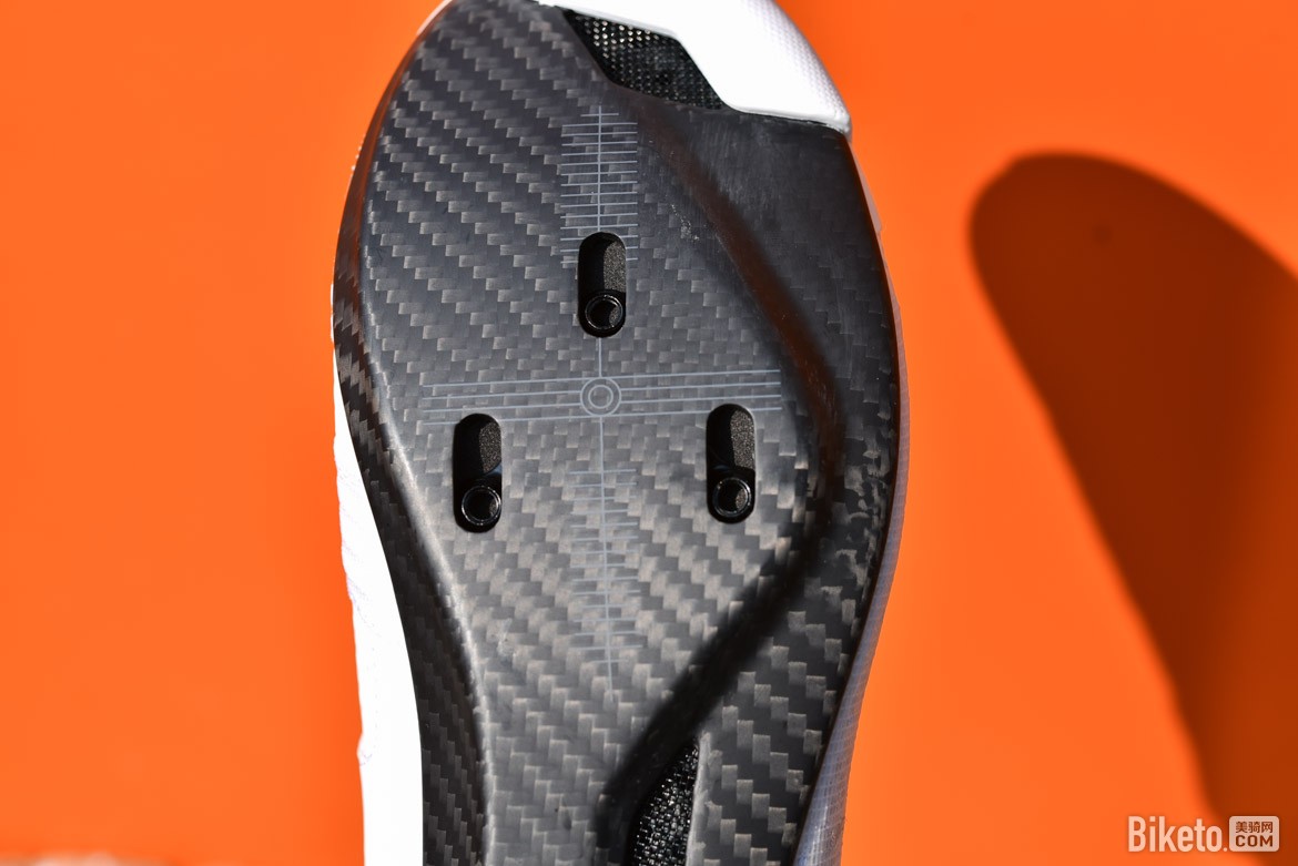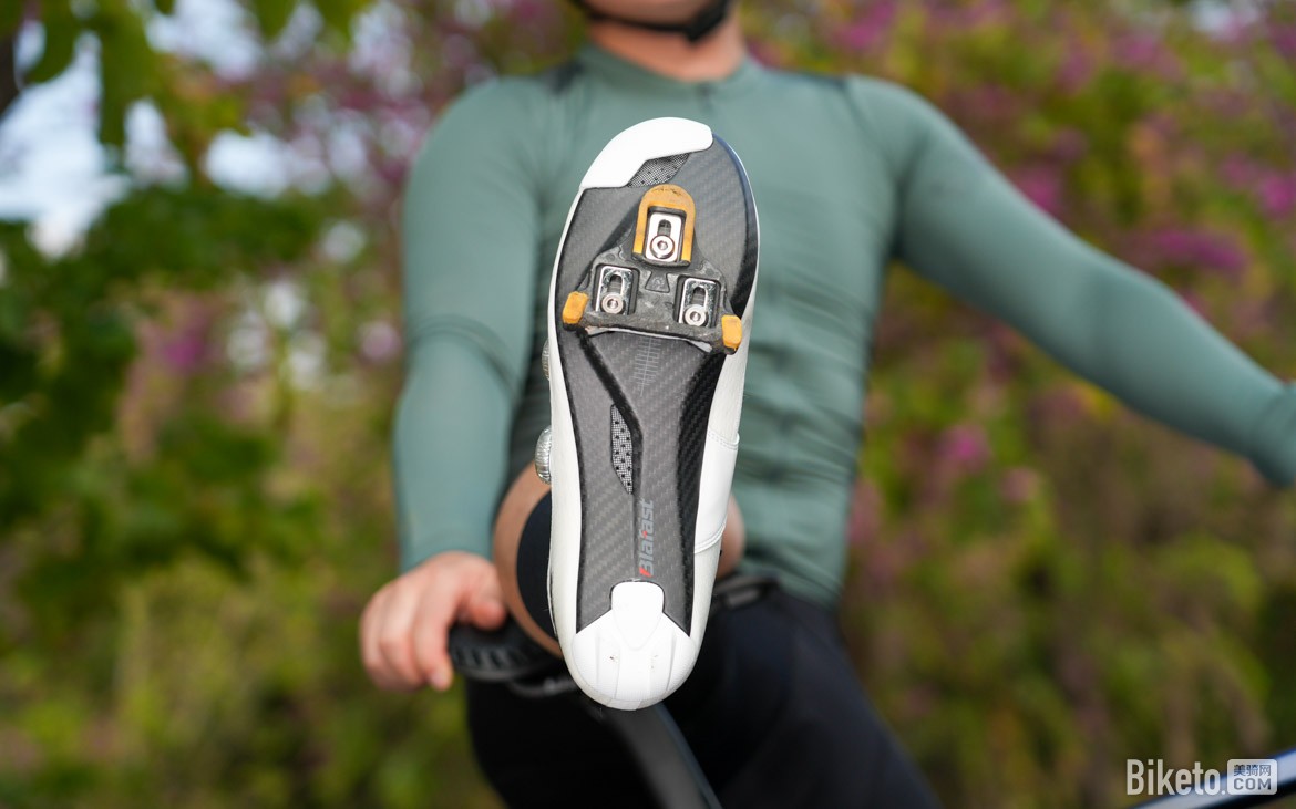 依据个人骑行习惯设定,很快将锁片安装上去,发现两侧上收的碳纤维鞋底设计要比常规平底的看起来更加“苗条”,锁片安装到位有足够的调整空间支撑整个鞋底,前后通风孔散热效果明显。