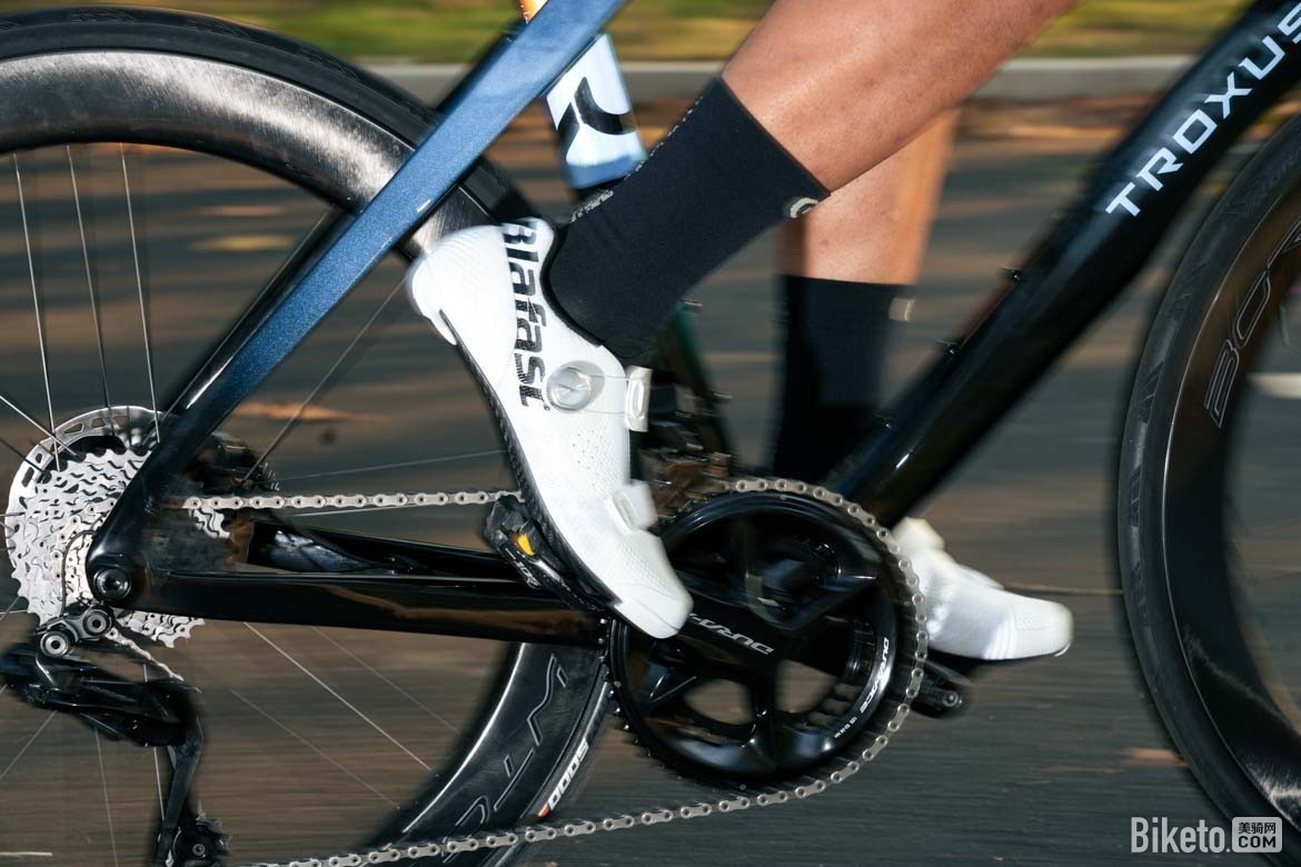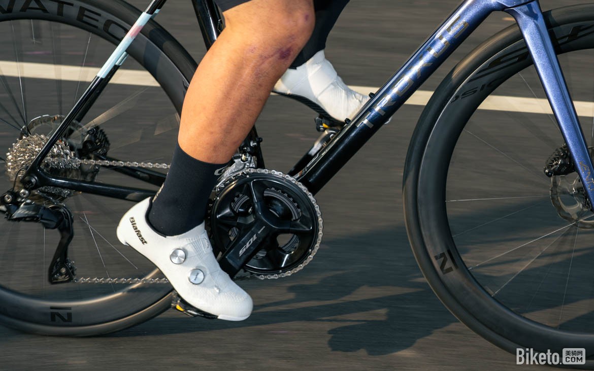 Blafast的碳纤维大底在发力反馈上更直接,尤其是在长距离爬坡后段,腿部疲劳时,刚性优势更明显,能减少不必要的能量损耗。一体式的鞋面设计能有效减少风阻,高速骑行时不会有“兜风”感,减少功率损失,对续航有一定辅助作用。